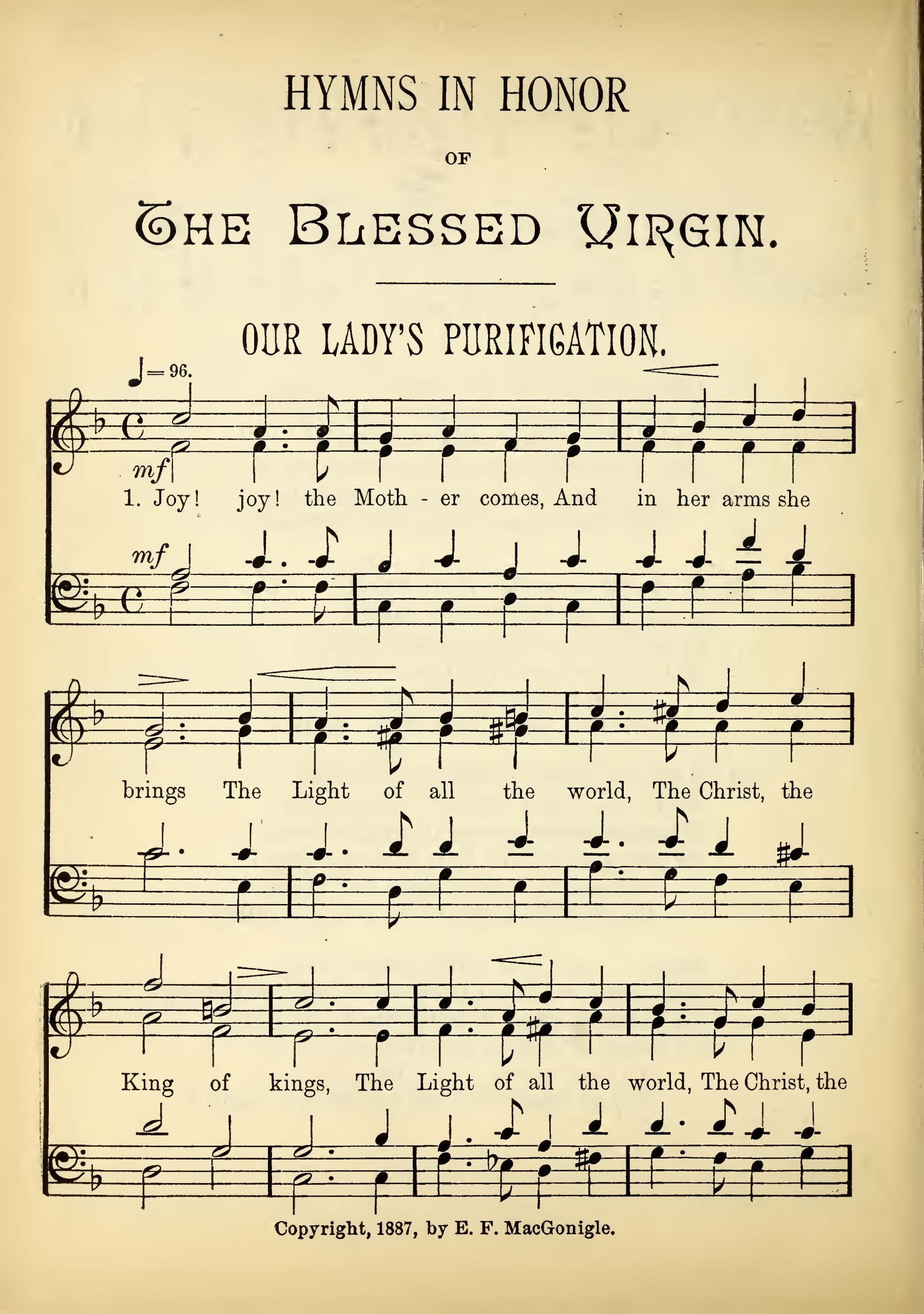 Father Frederick William Faber (1814-1863) wrote the words of this hymn for the Feast of The Purification. The earliest appearance of this hymn was in the second edition of his JESUS AND MARY hymnal. This collection of hymns was published in 1852 by Richardson and Son of London. The second edition had more than twenty new hymns and was published throughout England and Ireland.