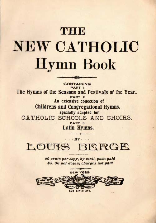 Around 1896, The Berge Music Company was established and in 1904, Louis published his first Catholic hymn book: BERGE’S BOOK OF GEMS for the use of Catholic Schools and Choirs. With the success of his first hymn book and at the request of many of the religious entrusted with the education of Sunday School and Parish Schools, Louis published THE NEW CATHOLIC HYMN BOOK, 1906;