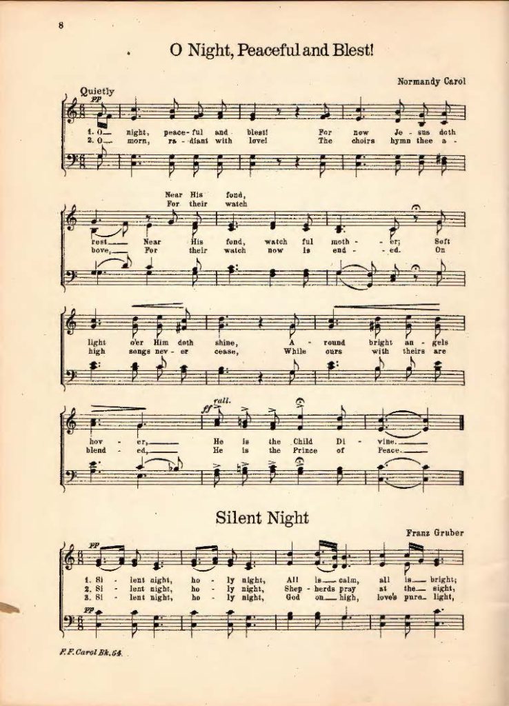 - Hymnals with – Silent Night, Sacred Night, Bethlehem sleeps, yet what light (LAUDIS CORONA)