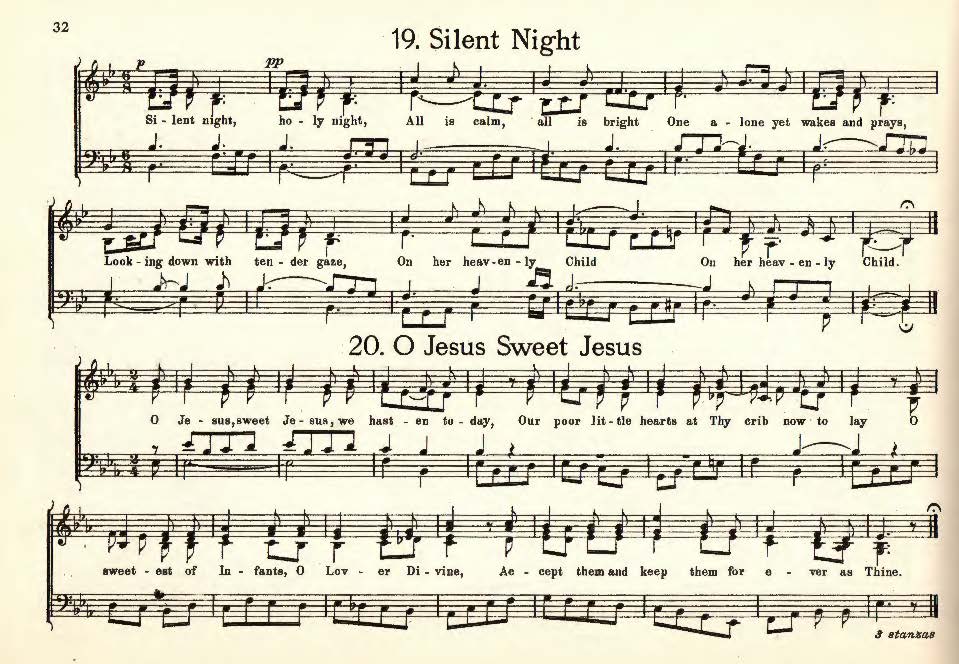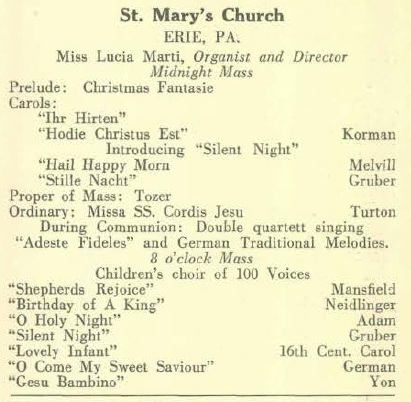 The usage of Silent Night in Catholic Christmas concerts or in Christmas programs appeared as early as 1915. In some parish Christmas programs the hymn was being used as the Processional and in other parishes, it was being Introduced. This programing continued into the 1930s. Below are a couple of examples.