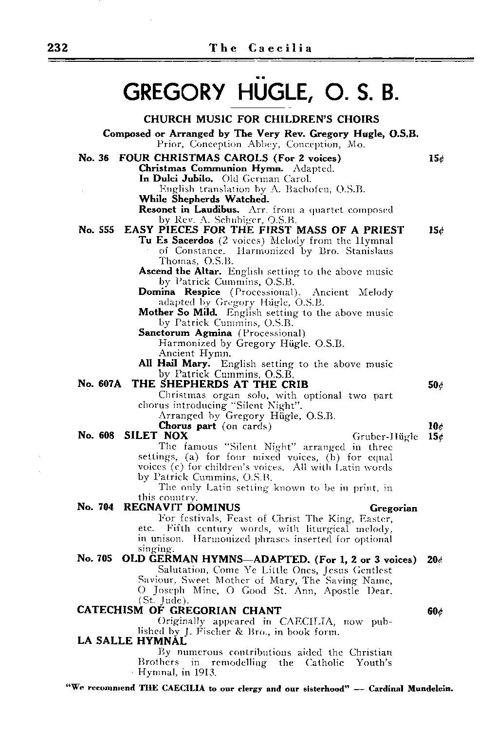 From my review of the Caecilia Magazines, I learned of a Latin version of Silent Night – Silet Nox with Latin words arranged by DOM Gregory Hugle, O.S.B., which appeared in the July-August 1932 issue, Vol. 59 No. 7., but after an extensive search through the archives I could not find this arrangement. This arrangement was sold by McLaughlin and Reilly Music Company of Boston.