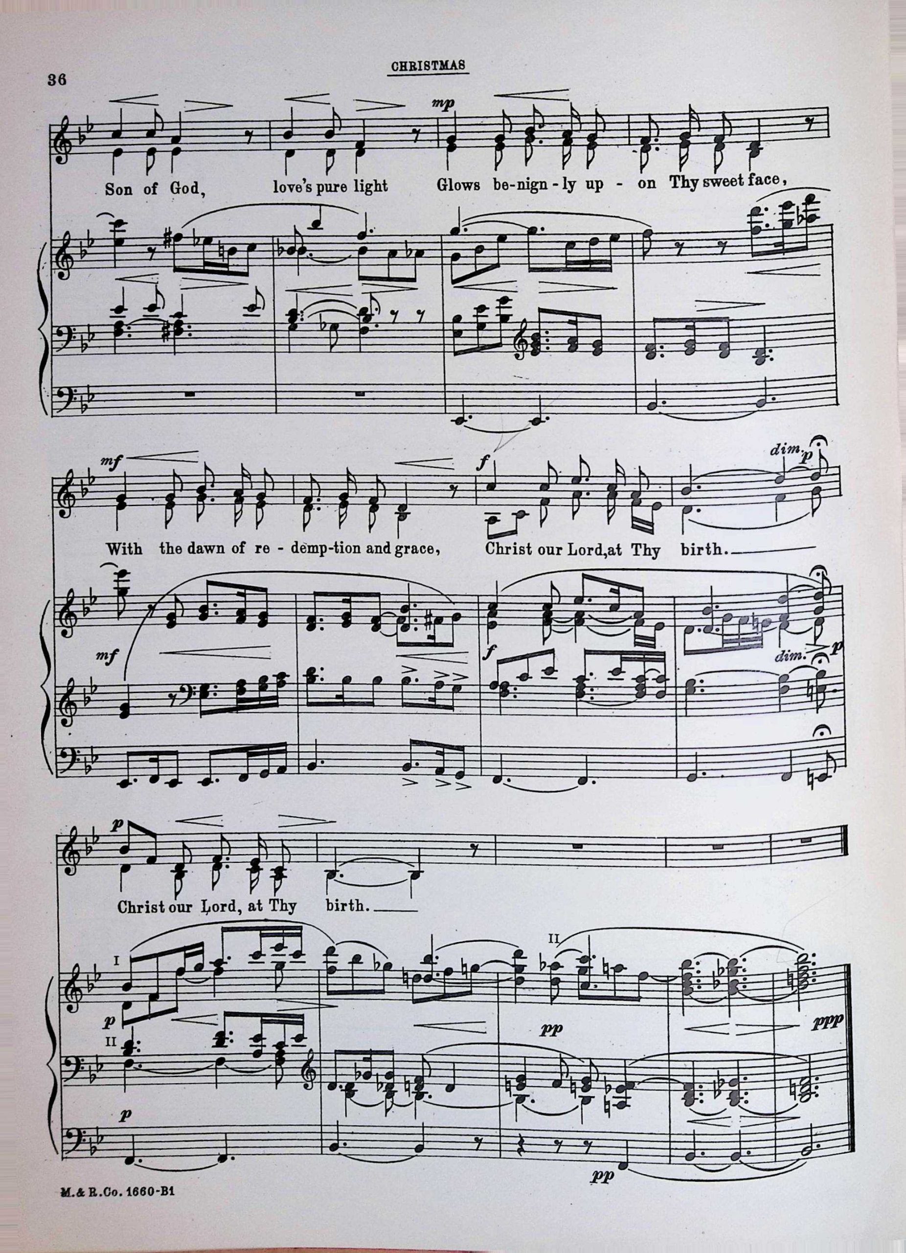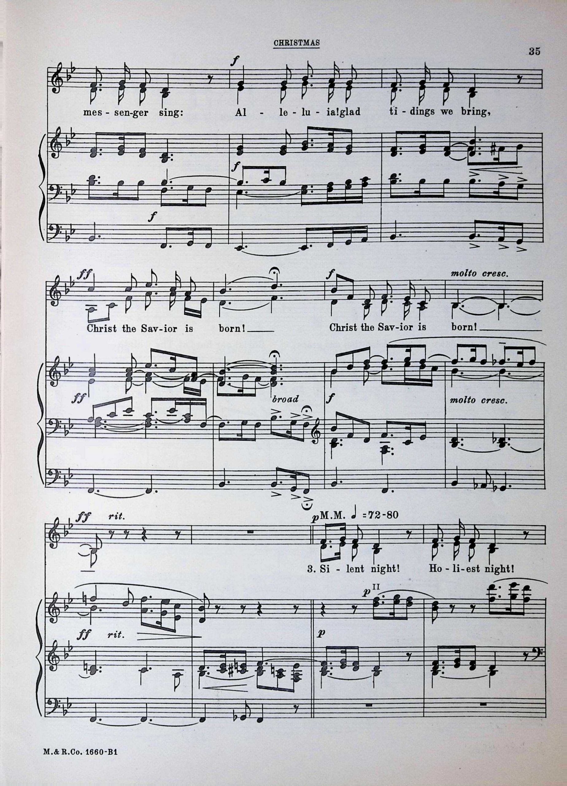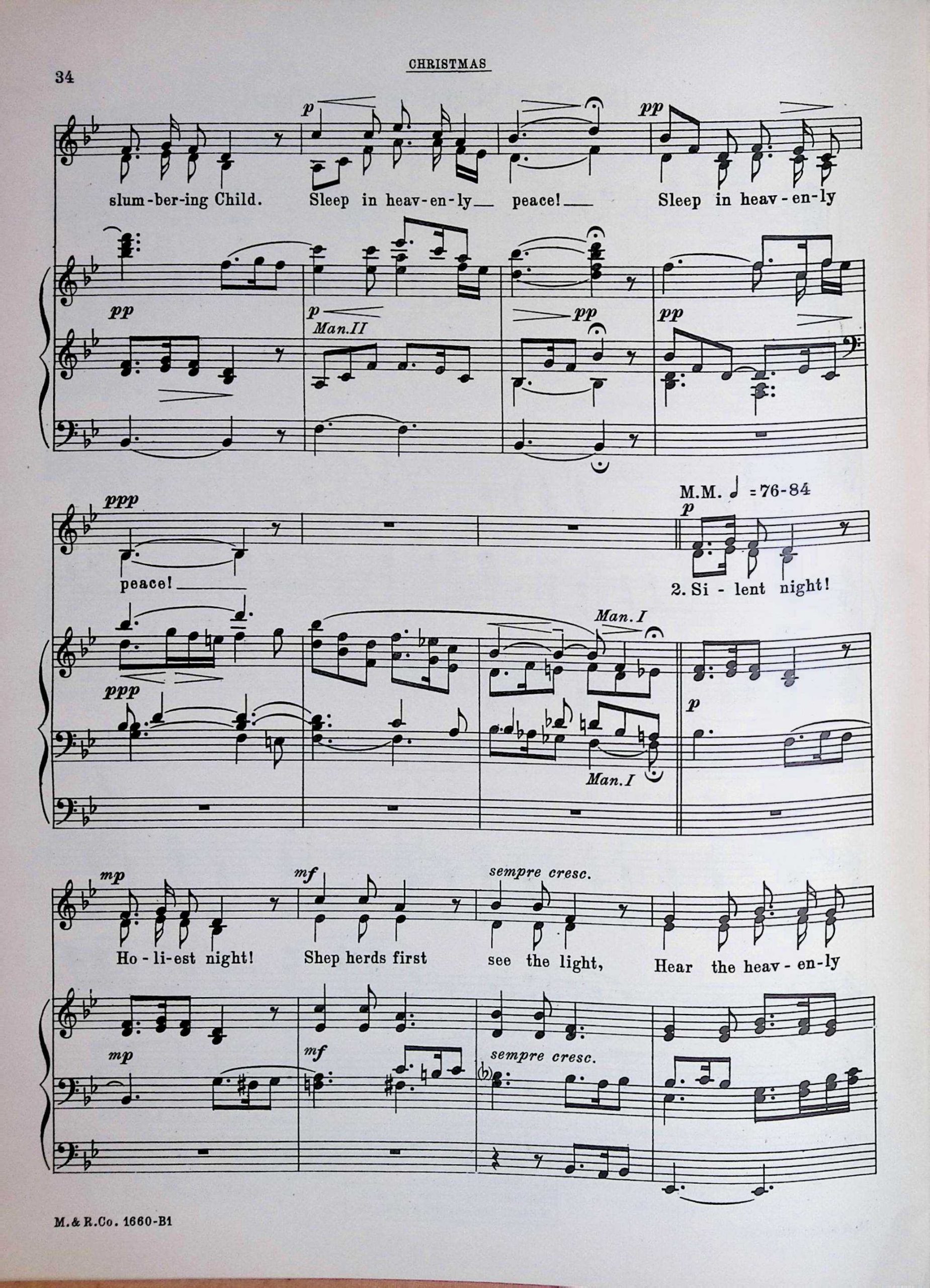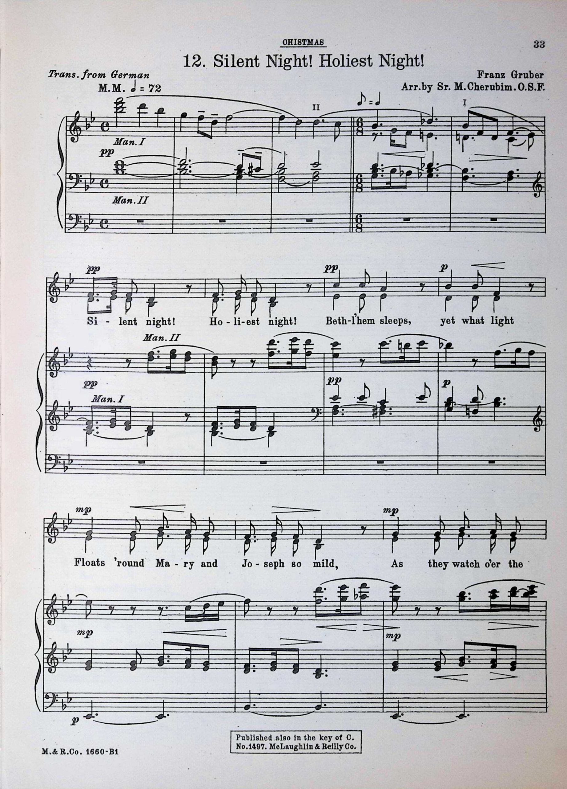 During the late 1940s, the ALVERNO HYMNAL AND CHOIR BOOK compiled and edited by Sister Mary Cherubim Schafer, O.S.F., was a high-point in the German-American tradition. It was originally printed in 1948 and enlarged in 1954. It was published by McLaughlin & Reilly Music., Co., The text of the hymn was a variant of the Laudis Corona text, substituting Holiest Night for Sacred Night and other edits. (click on any image to enlarge)